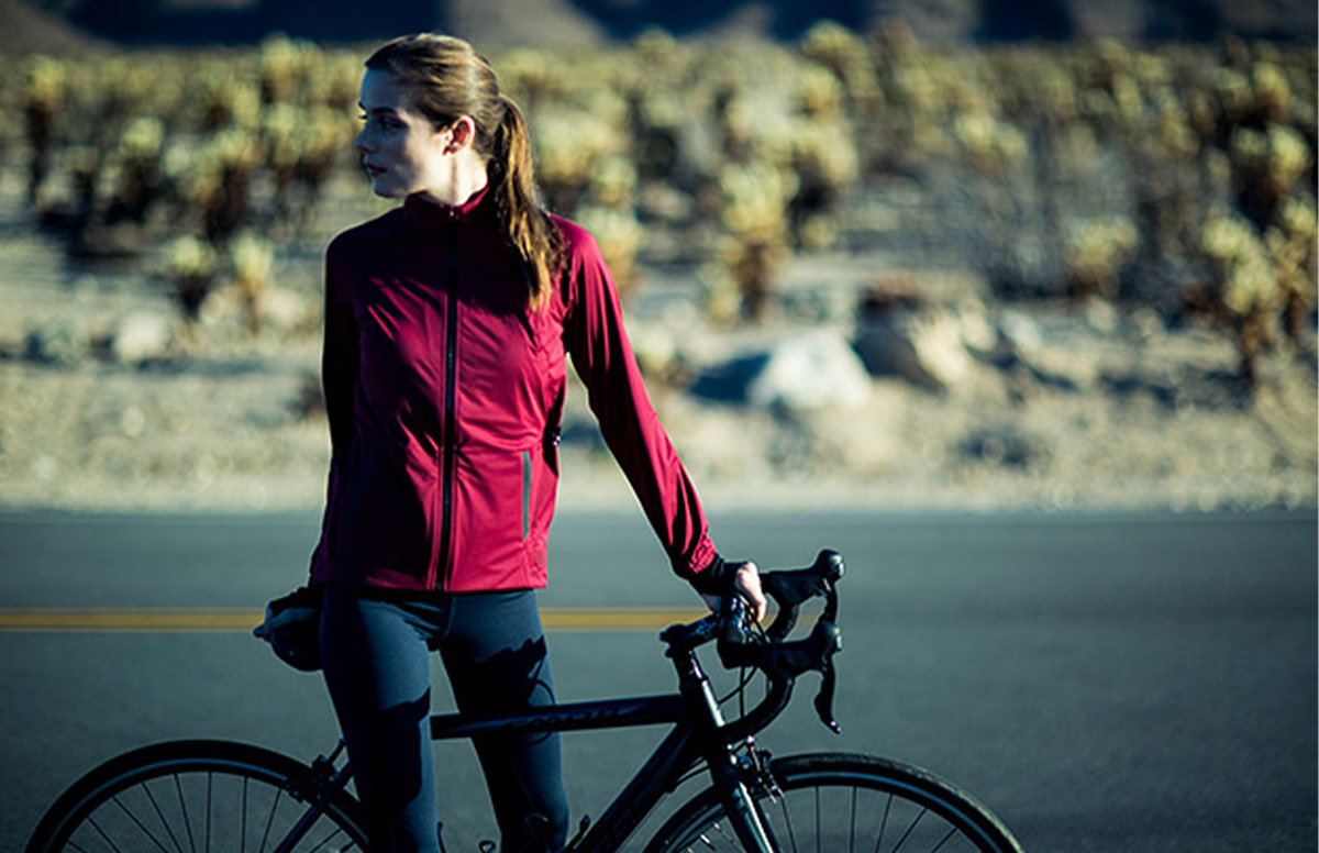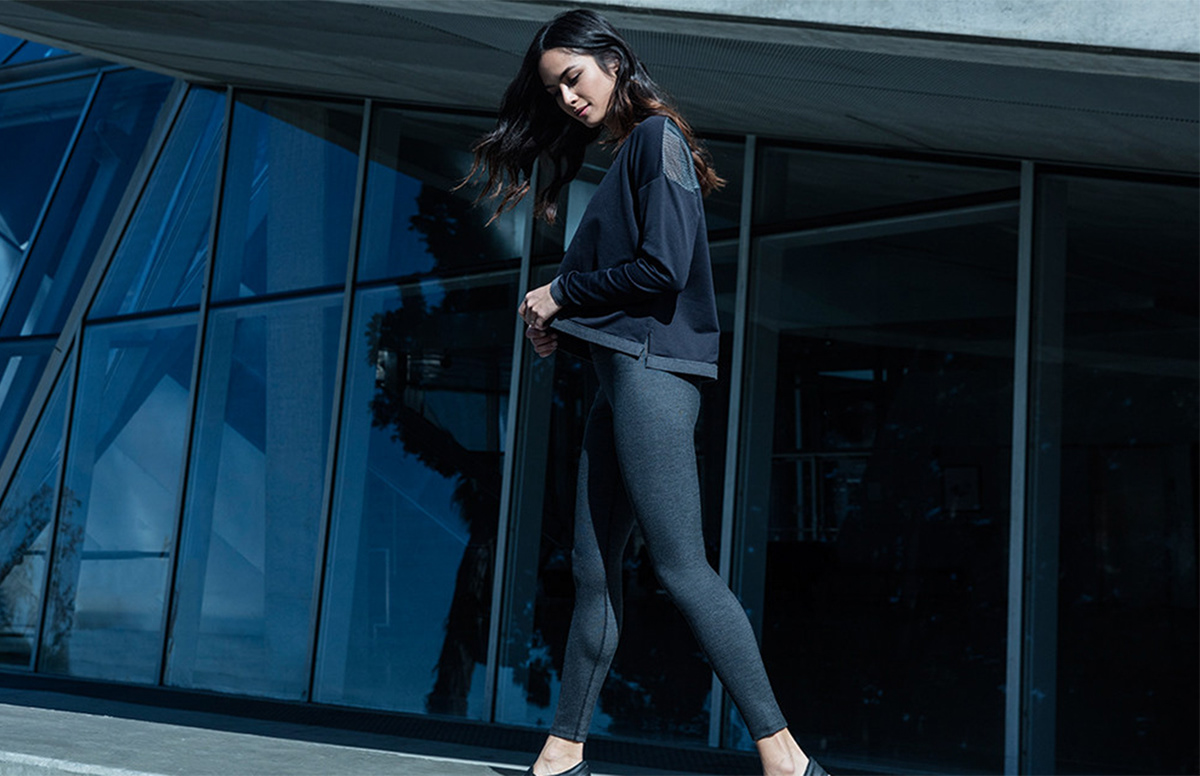 Italian stretch nylon jersey / reflective patch at back leg / flattering wide waistband / visually slimming paneling