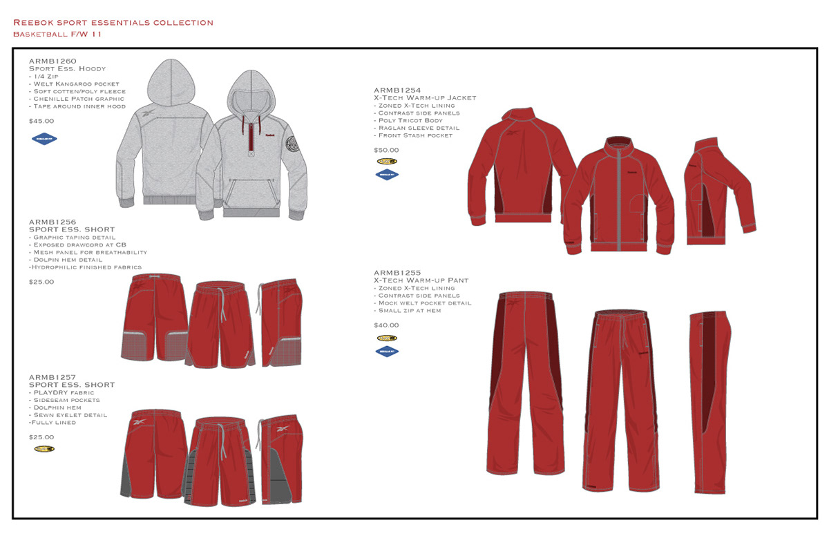 THIS COLLECTION WAS DESIGNED FOR THE MEN'S SPORT ESSENTIALS BASKETBALL LINE. I WAS INSPIRED BY OLD-SCHOOL DETAILS AND TRANSLATING THEM IN A MODERN WAY THROUGH OUR SEASONAL "CONNECT" STORY. I HAD TO MAKE SURE TO MAINTAIN MARGINS WITHOUT SACRIFICING DESIGN.